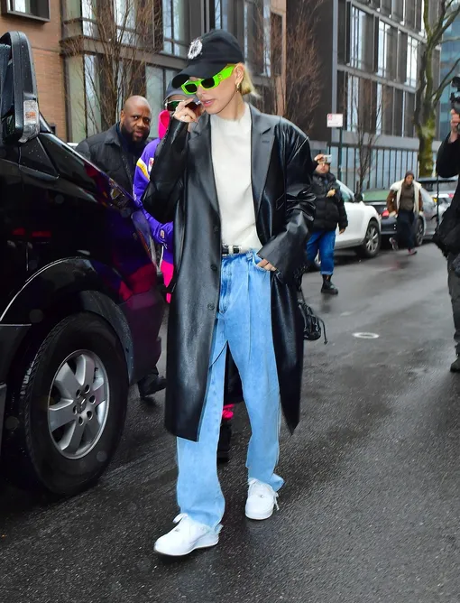Модель надела кожаный черный плащ, под которым у нее оказался белый топ и свободные классические голубые джинсы. Черная бейсболка и белые кроссовки — Хейли продумала свой выход до мелочей.