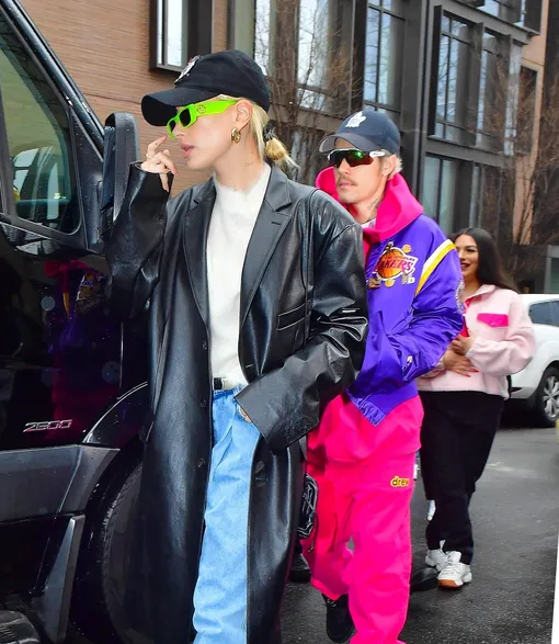 Хейли попала в объективы папарацци вместе с Джастином Бибером. Музыкант сделал ставку на агрессивный розовый и насыщенный фиолетовый цвета, а его супруга разбавила аутфит солнцезащитными очками в неоновой оправе.
