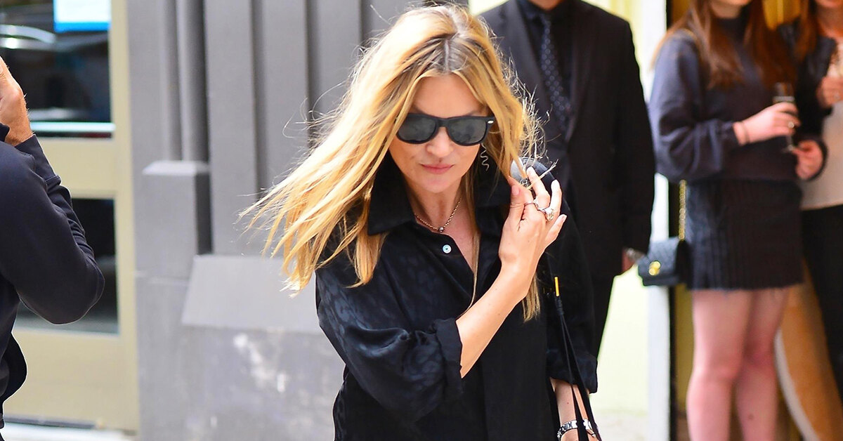 Кейт Мосс обожает черный цвет и готова круглый год собирать образы в любимой палитре. Сейчас британская супермодель гостит в Нью-Йорке и каждый день балует нас своими выходами в 50 оттенках черного. Для ланча с друзьями в Большом яблоке Мосс выбрала рубашку с леопардовым принтом, который был едва заметен на черной ткани, и объединила ее с темными джинсами клеш, прямоугольной сумкой Saint Laurent и кожаными ботильонами на устойчивом каблуке. А солнцезащитные очки с темными стеклами позволили нашей героине скрыть следы веселья после пышной свадьбы Марка Джейкобса.