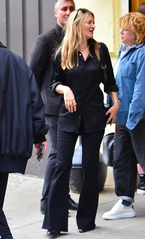 Джинсы клеш и леопардовый принт на черном фоне: расслабленный total black от Кейт Мосс