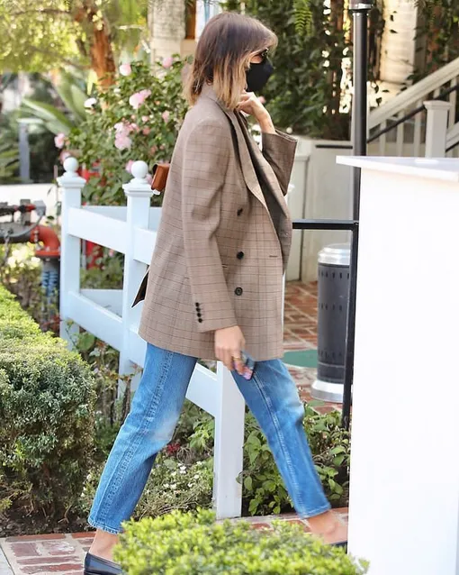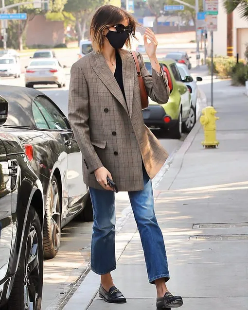 Сегодня посмотрим, как носить джинсы клеш на примере Кайи Гербер. Модель выбрала укороченный вариант, который будет гораздо удобнее в повседневных образах, чем ультрадлинные модели. В пару к нему она выбрала объемный жакет в клетку, как с мужского плеча, и простой черный топ — в общем, ничего лишнего. Такой жакет точно никогда не выйдет из моды и будет актуален и через сезон, и через год — а носить его можно и с джинсами, и с классическими брюками, и даже поверх изящного платья-комбинации из шелка. Завершить лук она решила черными лоферами (универсальная базовая обувь для весны) и миниатюрной коричневой сумкой с короткой ручкой (эта форма сейчас переживает буквально второе рождение). В таком виде можно пойти и на прогулку, и отправиться по делам — это будет уместно практически в любой ситуации.