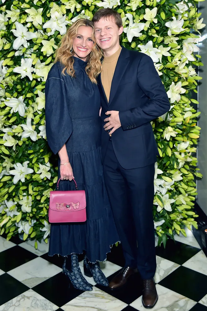 В последнее время Джулия Робертс часто появляется на светских мероприятиях в компании 22-летнего актера Лукаса Хеджеса, но супругу актрисы рано бить тревогу: Лукас и Джулия сдружились на съемках драмы «Вернуть Бена» (Ben Is Back), в которой сыграли маму и сына. С тех пор Робертс мягко «опекает» своего коллегу. Вот и вчера актриса посетила мероприятие в честь перспективного таланта Хеджеса, которое прошло в Беверли-Хиллз. Для вечера Джулия выбрала закрытое приталенное платье из плотного денима с необработанным низом, остроносые ботильоны с пестрым принтом и яркую прямоугольную сумку с узором в виде бабочек.
