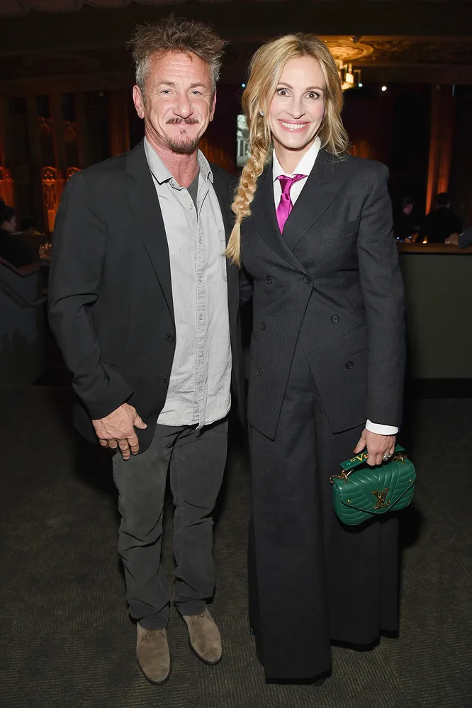 В этом году на благотворительном вечере Пенна решили поддержать не только дочь Дилан и сын Хоппер, но и Джулия Робертс, которая выбрала для мероприятия графитовый костюм-двойку (их Джулия начала носить до того, как это стало мейнстримом). Актрисе приглянулись широкие брюки с высокой талией и двубортный пиджак с объемными плечами, а главными акцентами в образе стали атласный галстук цвета фуксии и изумрудная миниатюрная сумка Louis Vuitton.