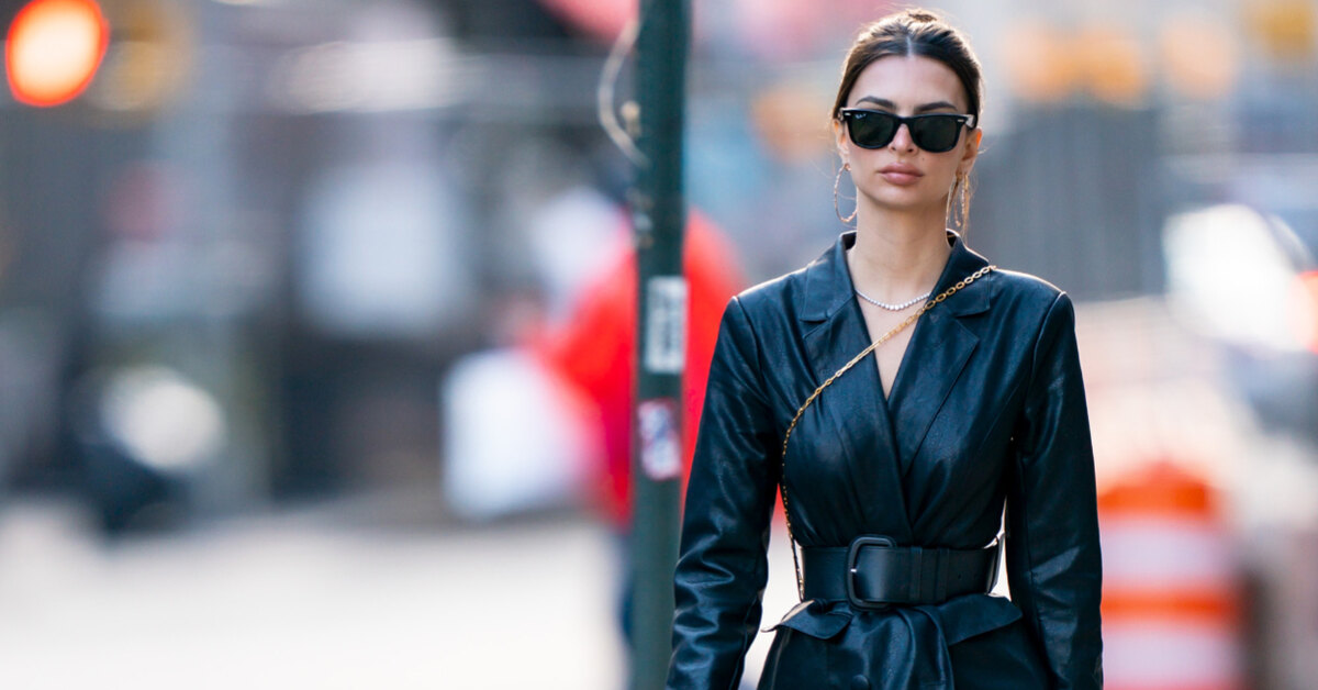 Эффект точеной талии: Эмили Ратаковски сочетает кожаный пиджак с широким ремнем и спортивными брюками
