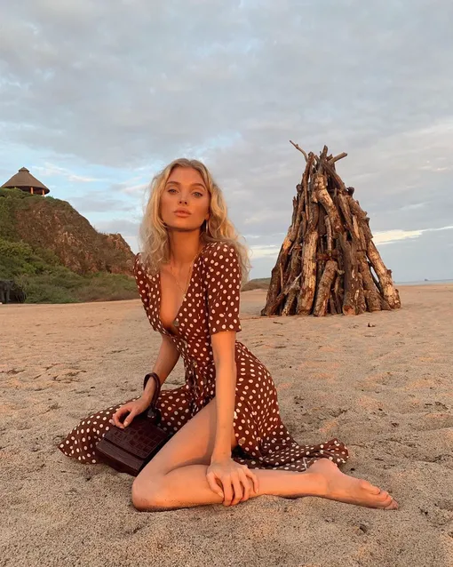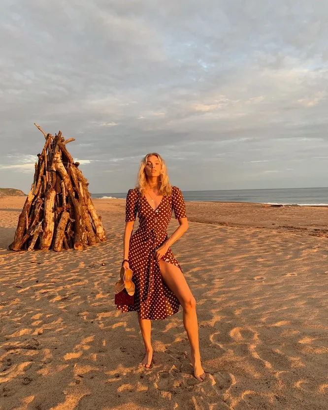 Как выглядит самое модное платье этого лета? Ответ знает шведская топ-модель Эльза Хоск: для встречи заката на мексиканском побережье девушка выбрала платье в горошек из коллекции американского бренда LPA. Образ она дополнила кожаными мюли бежевого цвета от Manolo Blahnik и маленькой сумкой By far с тиснением под кожу рептилии.