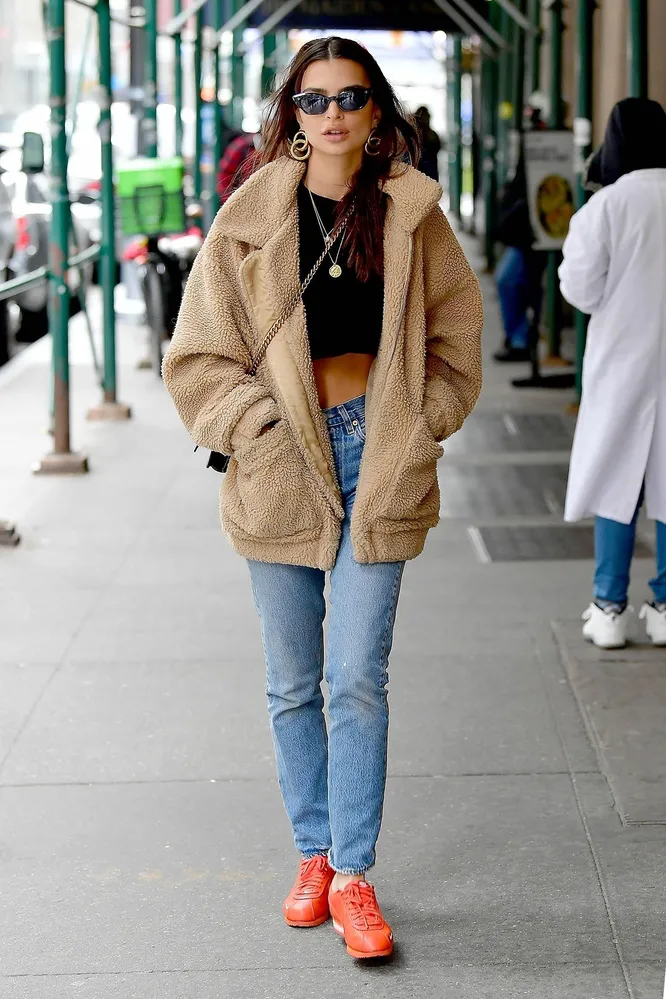 Судя по всему, не только в Москву еще не пришла весна: жители Нью-Йорка тоже с нетерпением ждут тепла, а пока вынуждены кутаться в верхнюю одежду. Но Эмили Ратаковски нашла способ не замерзнуть и при этом, по традиции, подчеркнуть свою стройную фигуру. Модель отправилась на прогулку по Большому яблоку в короткой шубе-«чебурашке» в бежевом цвете. Эмили нарочно не стала запахивать уютный верх, чтобы был виден ее черный кроп-топ и тонкая талия. Не обошлось и без ярких акцентов: Ратаковски выбрала кожаные кроссовки в сочном морковном оттенке, каскад из нескольких цепочек с кулонами и массивные серьги.