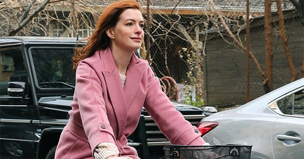 Энн Хэтэуэй в пальто Max Mara катается на велосипеде по морозному Нью-Йорку