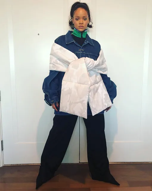 Для прохладного начала весны Рири придумала свой лайфхак: на уютный черный костюм Fenty x Puma и объемный джинсовый жакет Y/Project она накинула стеганый белый шарф Nicopanda, а чтобы образ выглядел не слишком спортивно, добавила к нему остроносые ботильоны и отправилась гулять по ветреному Нью-Йорку.