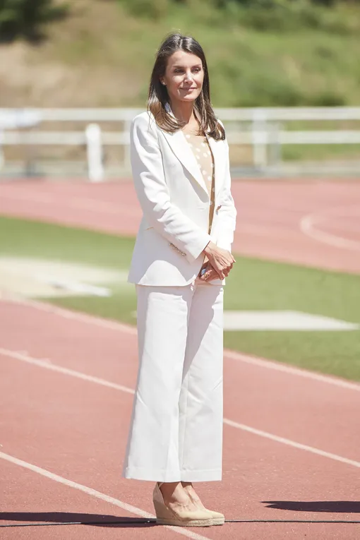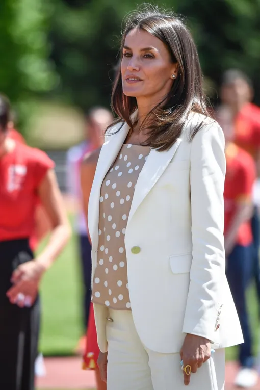 Наша героиня составила безупречный образ, идеальный для летнего делового гардероба. Летиция подчеркнула свою стройную фигуру белоснежным костюмом, состоящим из жакета с золотыми пуговицами и кюлот. Жена Филиппа VI дополнила аутфит кремовой блузой с принтом в «горох».