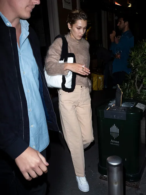 В ближайшие восемь месяцев теплые свитеры — наши лучшие друзья. Отнеситесь к покупке серьезно, при выборе трикотажа важно обратить внимание на качество материала, который не только будет согревать вас на совесть промозглыми осенними вечерами, но еще и сохранит товарный вид на несколько сезонов вперед. Белла Хадид отдает предпочтение пушистой ангоре — и правильно делает. Во-первых, в ней крайне комфортно, а во-вторых — тепло. Супермодель сочетает свитер из ангоры с джинсами в одной цветовой гамме.