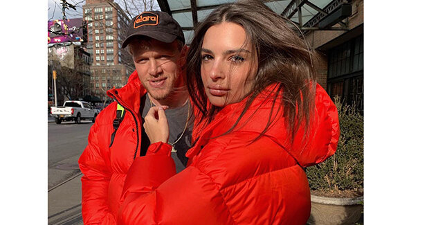 Family look: Эмили Ратаковски с мужем в парных алых пуховиках