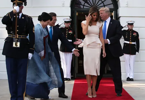 На днях Белый дом с официальным визитом посетил президент Южной Кореи Мун Чжэ Ин с супругой. Вместе с мужем Дональдом Трампом высокопоставленных гостей встречала первая леди США Мелания. Для такого торжественного случая миссис Трамп выбрала нежно-розовое платье с широкими бретелями и баской французского бренда Roland Mouret, которое дополнила классическими лодочками Christian Louboutin нюдового оттенка.