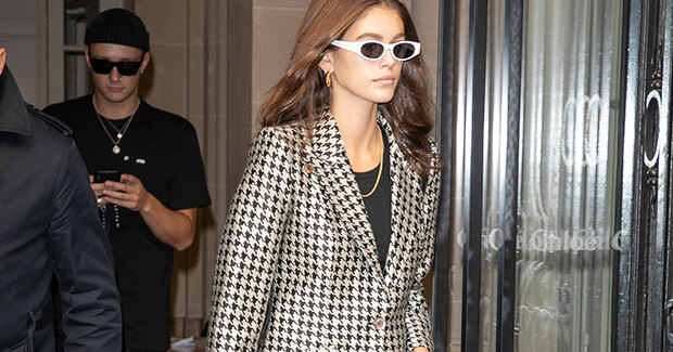 Неделя моды в Париже стартовала – и куда же без Кайи Гербер! 17-летняя модель заблаговременно прибыла в столицу Франции и теперь активно готовится к предстоящим показам. Папарацци застали ее на выходе из офиса Chloé. Дочь Синди Кроуфорд была в кожаных черных легинсах и простом топе в тон, поверх которого надела приталенный жакет с принтом «гусиная лапка». Образ девушка дополнила очками овальной формы в белой оправе, поясной сумкой Prada, накинутой на плечо, золотой цепью на шее и кроссовками Alexander Wang из весенне-летней коллекции.