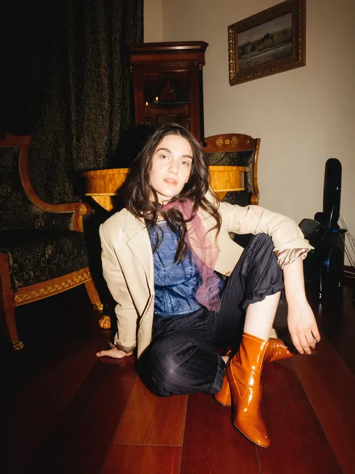 Кожаное пальто идеального бежевого цвета – обожаю его. Это винтаж, доставшийся мне от тети. Я его особенно люблю, потому что он очень аутентичный – мне кажется, это тот самый референс, которым могли вдохновляться Maison Margiela или Миучча Прада. Часто люди думают, что пальто от одного из этих дизайнеров. На подкладке вышито название бренда, но я даже не могу его разобрать. Брюки ношу с 9 класса, мне их мама купила для школы. Хорошие вещи служат долго. На ботильоны наткнулась совершенно случайно – зашла в Mango с подругой, увидела их и влюбилась. Надела прямо в зале и так в них и вышла. Шарфик – это просто отрез из магазина тканей. Люблю розовый цвет.
