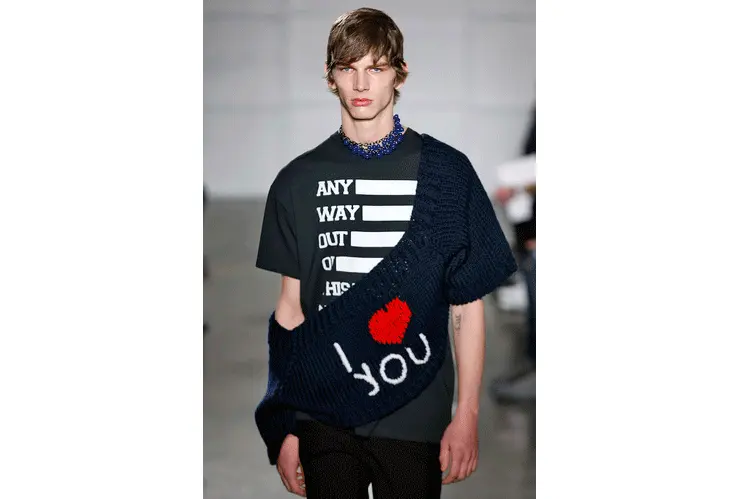 Сославшись на инди-рокеров, «Отпуск без конца» Джима Джармуша и туристическую нью-йоркскую сувенирку, дизайнер выпустил на подиум тинейджеров родом из 90-х, одетых в широкоплечие сюртуки с атласным блеском, клетчатые пиджаки «на вырост» с рукавами, наполовину заимствованными у спортивных толстовок, и жилеты, перетянутые цветным «скотчем-ремнем». Растянутые футболки и грубые свитера-признания с нетленным бонусом I heart NY.