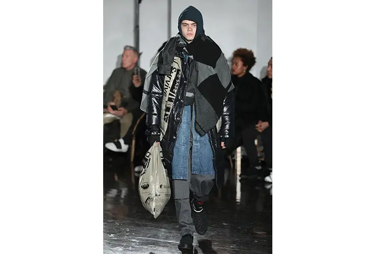 N.Hoolywood переусердствовал со страстью к уличной моде, доведя ее до абсурда. За идеями дизайнер японского бренда Дайсуке Oбана отправился в путешествие по городам Америки изучать жизнь бездомных. Фетишизация маргинальности происходит у него, как у Vetements, Balenciaga и Y/Project, через повторение беспризорных образов с помощью ну очень дорогой одежды из качественных добротных тканей: бесчисленные слои одежды, брюки на брюки, заправленные в треники худи, гигантские куртки и прочее.