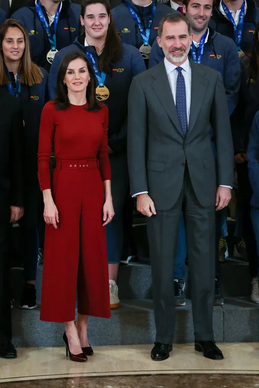 Для российской женской сборной по водному полу этот чемпионат Европы оказался не самым удачным: в финале наши соотечественницы уступили соперницам из Испании с обидным счетом 12:13. Но что одним расстройство, другим — триумф. Поздравить своих ватерполисток с победой решили король Испании Филипп VI и его супруга, королева Летиция. Первая леди появилась перед спортсменками в бордовом тотал-луке. К слову, эти джемпер и кюлоты с широким поясом от Hugo Boss мы уже видели на нашей героине. Свой эффектный образ монаршая особа патриотично дополнила лодочками от испанского бренда Lodi в насыщенном винном оттенке.