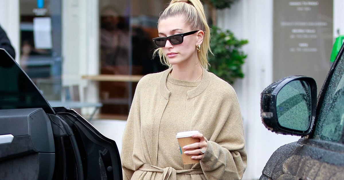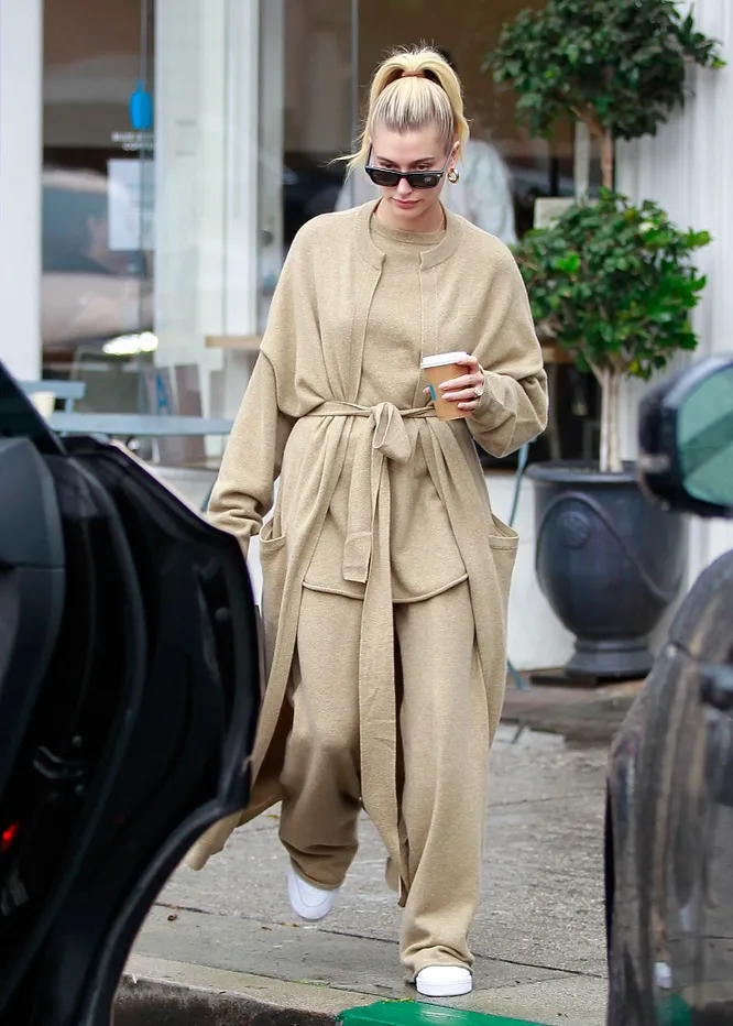 Хейли Болдуин задает настроение этих выходных. Ее теплое комбо для поездки на утренний кофе с супругом выглядит настолько уютно, что его хочется повторить прямо сейчас. Супермодель сделала ставку на трикотаж и total look в оттенках бежевого: сразу два важных тренда сезона. Миссис Бибер носит вязаный костюм-оверсайз в компании с длинным кардиганом-халатом в тон и дополняет образ простыми белыми кроссовками. Она обходится минимумом аксессуаров. Для такого образа ей достаточно пары золотых серег в стиле ретро, очков в массивной пластиковой оправе и обручального кольца. Стоит добавить длинное пальто маскулинного кроя, и этот наряд можно будет адаптировать для климата средней полосы.
