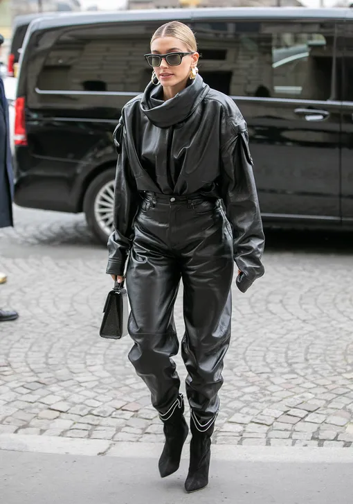 Завтра французский Дом Louis Vuitton представит свою новую осенне-зимнюю коллекцию в рамках Недели моды в Париже, а пока участницы показа посещают финальные примерки перед шоу. Одной из моделей на подиуме будет Хейли Бибер, которая за день до показа отправилась в офис LV в кожаном аутфите. Супругу Джастина Бибера заметили на парижских улицах в свободных черных брюках Attico, заправленных в замшевые ботильоны по последним трендам streetwear, еще более просторном лонгсливе с воротником-хомутом и с бархатной сумкой Hunting Season.