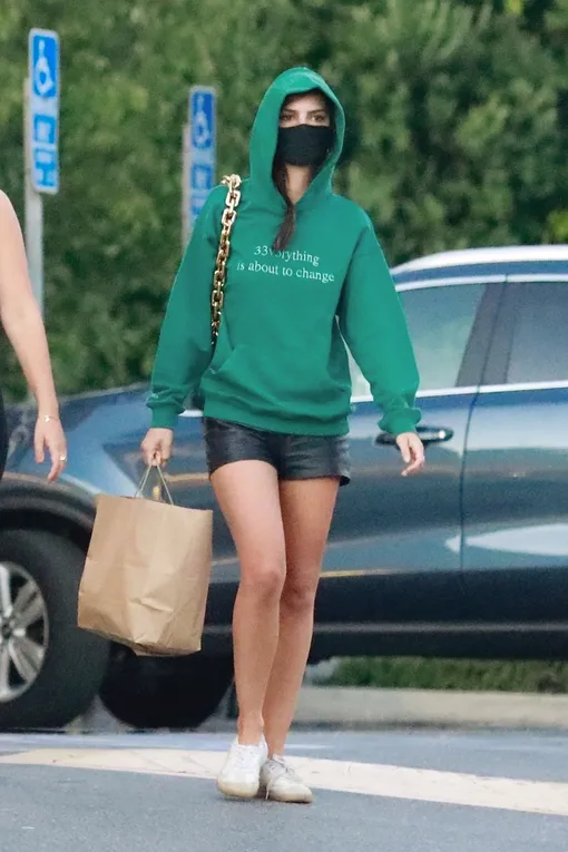 Образ модель дополнила лаконичными белыми кедами. В качестве аксессуаров она выбрала черную защитную маску и свою любимую модную сумку Bottega Veneta, которая идеально впишется в любой аутфит, что Эмили снова мастерски доказала. Звезда в маске на половину лица и капюшоне была почти неузнаваема, но ее обнаженные ноги не оставляли никаких сомнений в том, кто она.