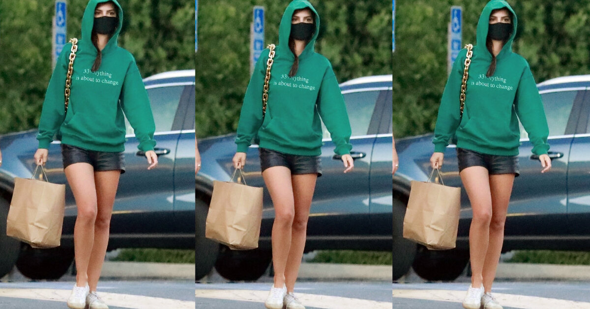 Модель отправилась за продуктами в компании мужа и друзей. Инстадива надела свободное худи изумрудного оттенка и крошечные черные кожаные шорты. Такой смелый наряд лишний раз подчеркнул точеную фигуру звезды: благодаря своим стройным длинным ногам у Эмили точно не было шанса не привлечь внимания на калифорнийских улицах.