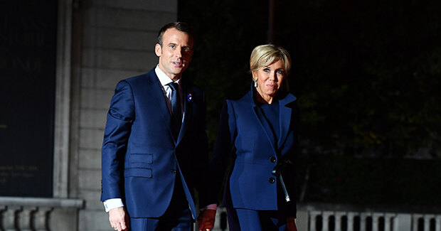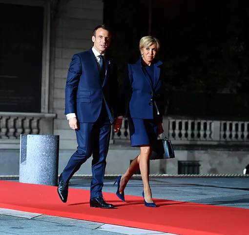 После официального мероприятия в Елисейском дворце по случаю 100-летия окончания Первой мировой войны главы государств и их первые леди были приглашены на ужин в Музей д'Орсэ. Хозяевами вечера стали Эммануэль и Брижит Макрон, которые прибыли первыми. Надо отметить, что наряды пары очень гармонировали. Первая леди Франции появилась в синем костюме с юбкой своей любимой длины — мини. 65-летняя мадам Макрон зачастую демонстрирует стройные ноги в коротких платьях и джинсах скинни.