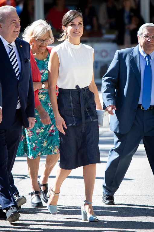 Вчера в Мадриде стартовала самая большая книжная ярмарка Испании. На торжественное открытие прибыла королева Летиция. Для выхода в свет супруга Филиппа VI выбрала простой и элегантный образ: белую блузу без рукавов Carolina Herrera, юбку из денима с декоративной обстрочкой, голубые босоножки Mini and Rose и клатч Furla, лаконичный и изящный по форме. Идеальное решение на каждый день!
