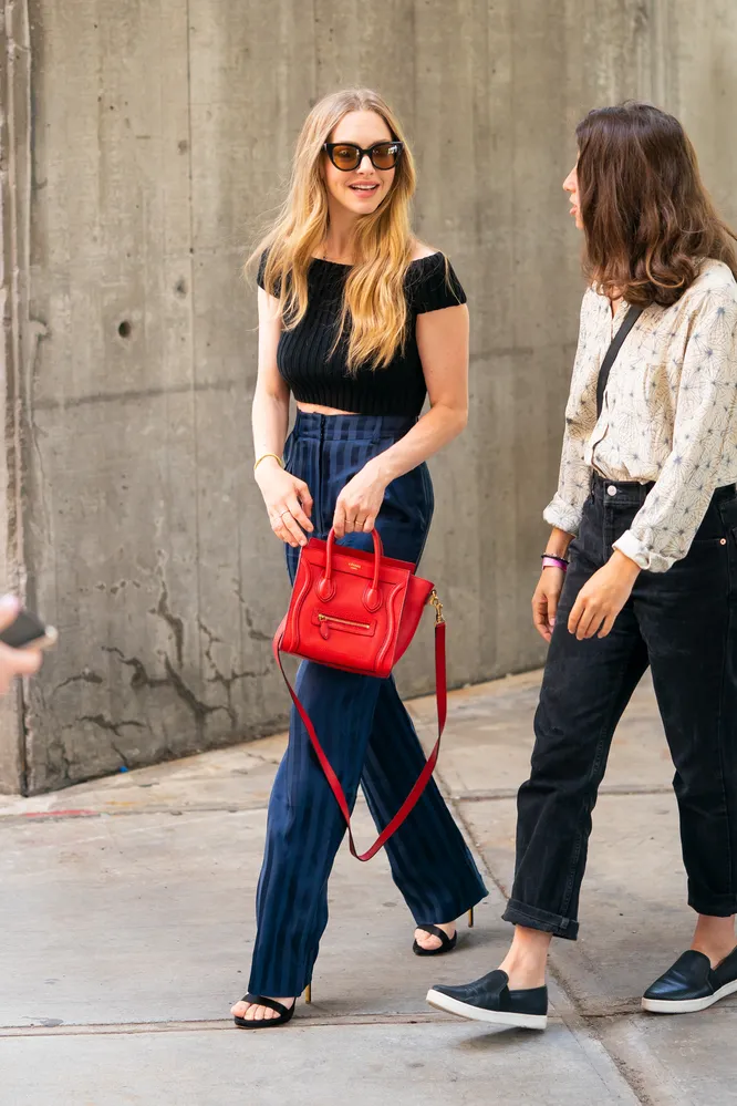 Сейчас большинство звезд нежатся на частных пляжах, отрываются на музыкальных фестивалях или готовятся посетить очередной модный показ, но есть и те, кто по каким-то причинам остался в городе. В числе последних – звезда Mamma Mia! Аманда Сейфрид. Сегодня папарацци поймали голливудскую актрису на одной из улиц Нью-Йорка в компании подруги. Для прогулки Аманда выбрала простой, но вместе с тем очень модный комплект: полосатые брюки-трубы с высокой посадкой, черный кроп-топ и замшевые босоножки на тонких ремешках. Ярким акцентом стала красная кожаная сумка от французского Дома Celine. Идеальный комплект для городских будней!