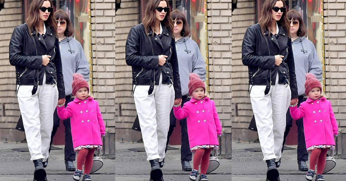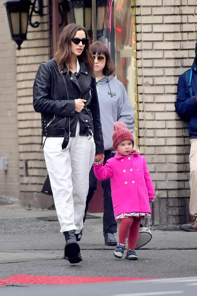 Звезда подиумов попала в объективы папарацци во время прогулки с двухлетней дочерью Леей де Сеной. Ирина составила безупречный образ для расслабленных дней. Она надела белую рубашку и свободные брюки этого же цвета, накинув поверх черную кожаную косуху. Бывшая возлюбленная Брэдли Купера завершила свой повседневный ансамбль грубыми ботинками.