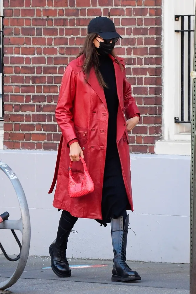 На этот раз нашей героине захотелось разбавить серые будни яркими цветами, и она пошла по самому банальному, но от этого не менее стильному пути — Ирина выбрала кожаный алый плащ, под которым у нее оказалось базовое трикотажное черное платье. Высокие сапоги на шнуровке и плотные черные колготки в тон завершили аутфит модели. Черная бейсболка и миниатюрная красная сумочка из крокодиловой кожи — Ирина выбрала аксессуары в цвет наряда. Еще одним неизменным «аксессуаром» нового времени стала защитная маска: ее Шейк тоже предпочла в черном цвете. Ирине мастерски удается балансировать на грани непринужденности и стиля, оставаясь при этом иконой для многих фэшиониста.