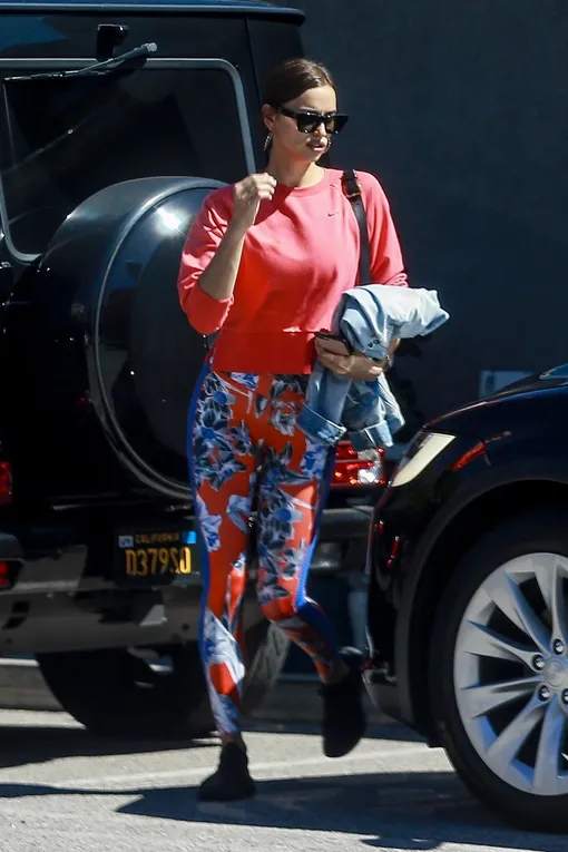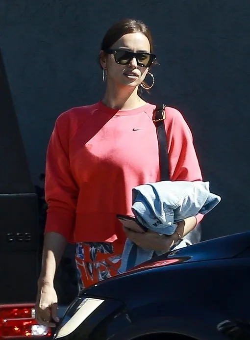 Хотя Ирина Шейк и пытается скрываться от папарацци, фотографы всегда начеку. Вчера российская супермодель попробовала спрятаться от преследователей при помощи джинсовой куртки, которую накинула на голову по пути к машине, но все равно попала в кадры хроники. Да и как было не запечатлеть Ирину в свитшоте Nike в сочном малиновом оттенке и легинсах с ярким цветочным принтом. А вот солнцезащитные очки наша героиня выбрала не в спортивном дизайне: от калифорнийского солнца глаза Ирины защищала пара от Celine с темными стеклами.
