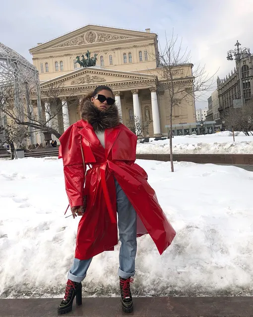 Тина позирует на фоне Большого театра в алом объемном тренче, который наверняка уже стал пределом мечтаний многих модниц. И без того яркую вещь модель сопроводила пушистым меховым воротником (видимо, Россия ассоциируется у нашей героини с соболиными мехами), свободными джинсами, ботинками с контрастными шнурками и солнцезащитными очками — непросто приходится весной итальянке в заснеженной России.