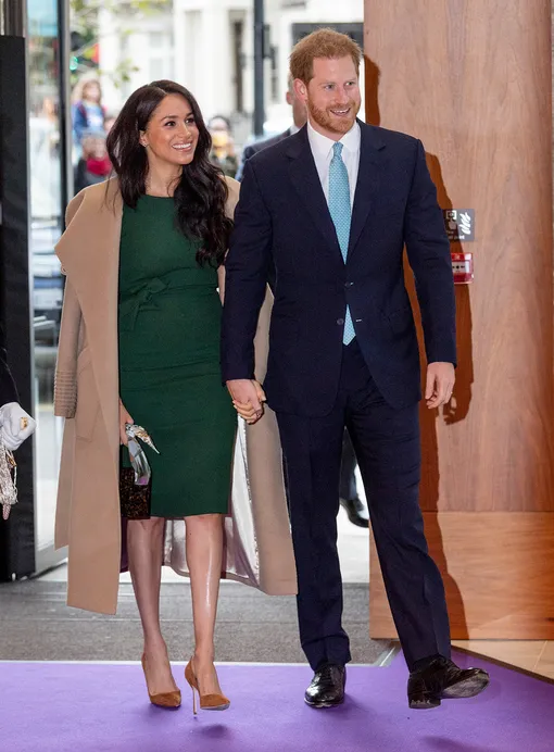 Герцогиня Сассекская прибыла на торжественный прием под руку с принцем Гарри: супруг и сам в открытую любовался на свою спутницу в изумрудном платье P. A. R. O. S. H., лодочках Manolo Blahnik в карамельно-горчичной палитре и бежевом пальто Sentaler, накинутом на ее хрупкие плечи. И отдельного упоминания достоин черепаховый клатч Montunas с романтичными ручками-платками — Меган знает толк в эффектных аксессуарах.