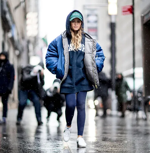 Под февральским дождем меховые пальто в пол снова сменили яркие гигантские пуховики, которые носят нараспашку, перетянув талию ремнем, как на показе Burberry, и спустив с плеч. В пару — не менее яркая бейсболка, вернувшиеся из небытия легинсы и кроссовки. Ну или остроносые черно-белые мюли Altuzarra с шотландским принтом. Обязательно - на плотные носки. Тогда это полноценная замена ботильонам на каблуке-зажигалке от Vetements.