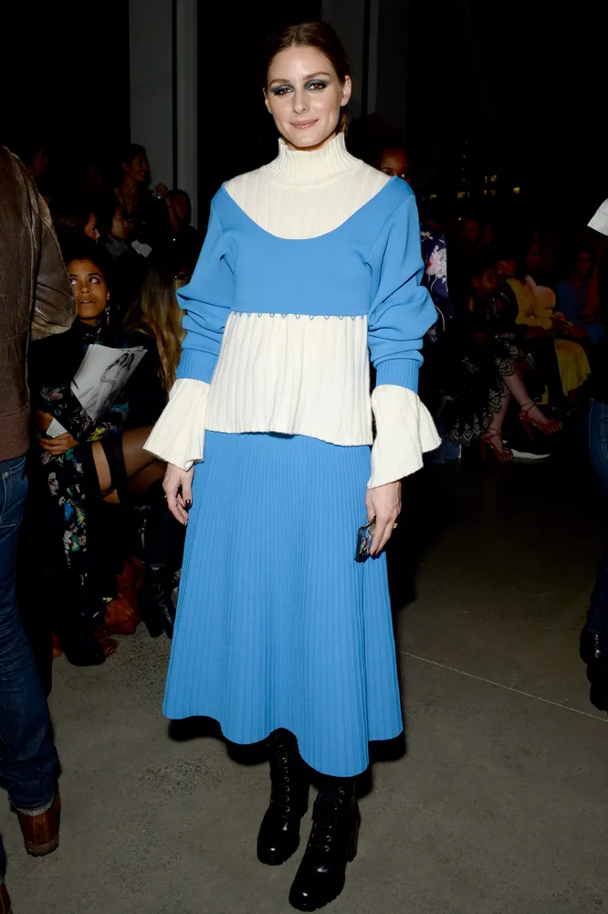 Оливия Палермо — одна из самых стильных девушек планеты, так что копировать ее образы не только незазорно, но и, наоборот, крайне разумно. Вчера блогер появилась на показе Prabal Gurung. Для шоу Оливия выбрала комплект из голубого топа и такого же небесного цвета юбки. Чтобы не замерзнуть под нью-йоркскими ветрами, под топ Палермо надела контрастную белую водолазку — все гениальное просто и красиво.