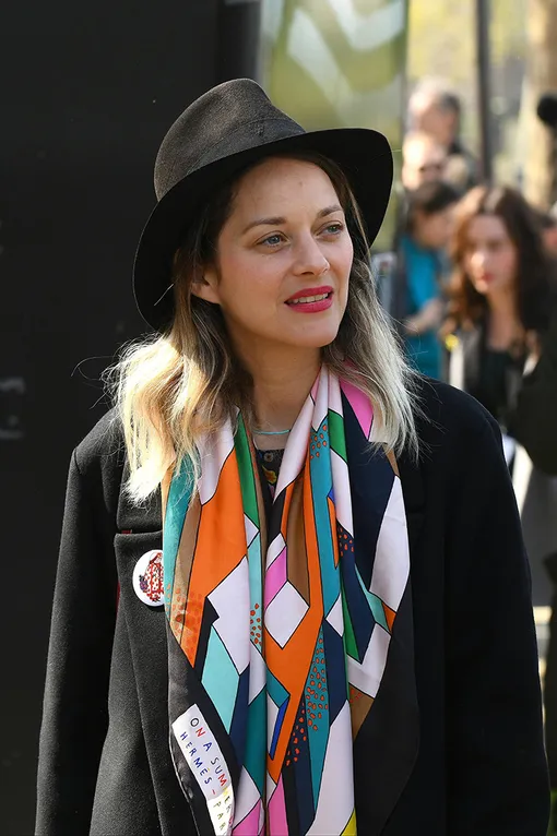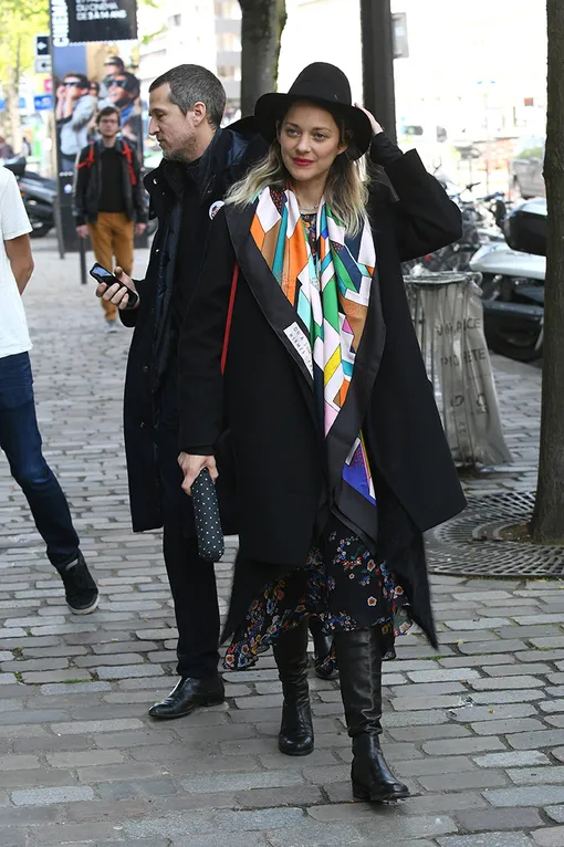 Марион Котийяр по праву считают одной из самых стильных современных француженок. Актриса с гордостью несет это негласное звание и всегда выбирает для выходов в свет очень женственные и стильные образы, которые за ней так и хочется повторить. На этот раз знаменитость была замечена на улицах Парижа в элегантном черном пальто, шляпе федоре в тон, кожаных сапогах с высоким мягким голенищем и цветочном летящем платье. Образ получился сдержанным и строгим, но всего лишь один аксессуар преобразил его — и это цветной шелковый платок Hermès. Он добавил наряду Марион истинно французского шарма. Берем на заметку!