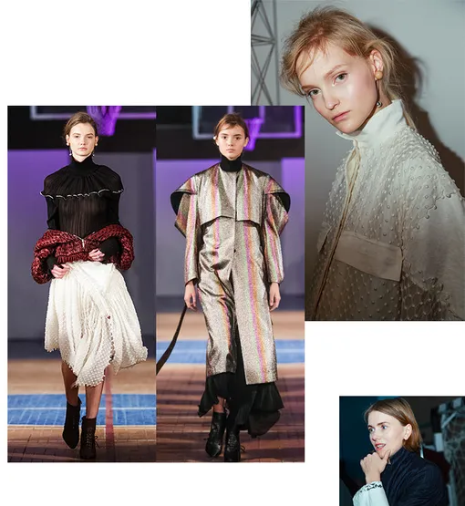 Сложносочиненные пальто-кофры и сезонные кожаные плащи, платья плиссе, тренчи из вышитого шифона и переходящие из коллекции в коллекцию платья-рубашки дизайнер сдабривает порцией готики. Исследуя родословную военного костюма, автор обращается к архетипу акетона, который носили под латами средневековые рыцари для смягчения ударов. У Litkovskaya они в двух вариантах — из черной кожи и болоньи. Плюс несколько маркеров streetwear вроде двусторонних бомберов с объемной вышивкой шелковыми нитями, платьев и боди из люрексового трикотажа, стеганых пуховиков и спортивных сумок, с которыми ходят в тренажерный зал. А на сладкое — ювелирка от Guzema Jewelry: броши и каффы.