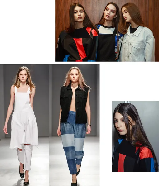 В новой Ksenia Schnaider представлено несколько таких ключевых продуктовых линеек. Первую образуют вещи из денима — темно-синего, вытертого голубого, черного и плотного белого. Причем как нового, так и перекроенного винтажного. Из него сшиты куртки, юбки, комбинезоны и собственно джинсы (а классическая белая рубашка с воротником из винтажного денима уже засветилась в подборке тренд-бюро WGSN по прогнозированию в области моды и дизайна). Другая ключевая линия — это платья, которые авторы кроят из костюмной шерсти, продвигая свой конструктор Custom Dress. И наконец, третья стратегия — Reworked Sportswear, или одежда из винтажной спортивной формы. В ее основе — идея использования беговых и футбольных олимпиек конца 1980-х в качестве сырья для новых бомберов, брюк и топов.