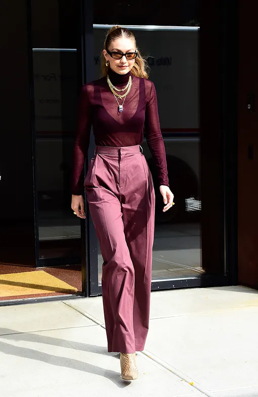 Вещи из шерсти и кашемира не обязательно должны быть объемными и безразмерными. Джиджи Хадид, которую папарацци подловили в Нью-Йорке, делает выбор в пользу тонкого джемпера, сквозь который неслучайно просвечивается нижнее белье. Это не единственная хитрость стилиста топ-модели. Низ и верх тотал-лука вишневого цвета, обожаемого Меган Маркл, различаются на несколько оттенков, что делает образ интереснее. А многочисленные золотые цепи добавляют изюминку.