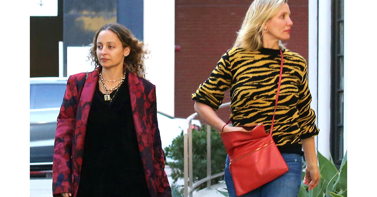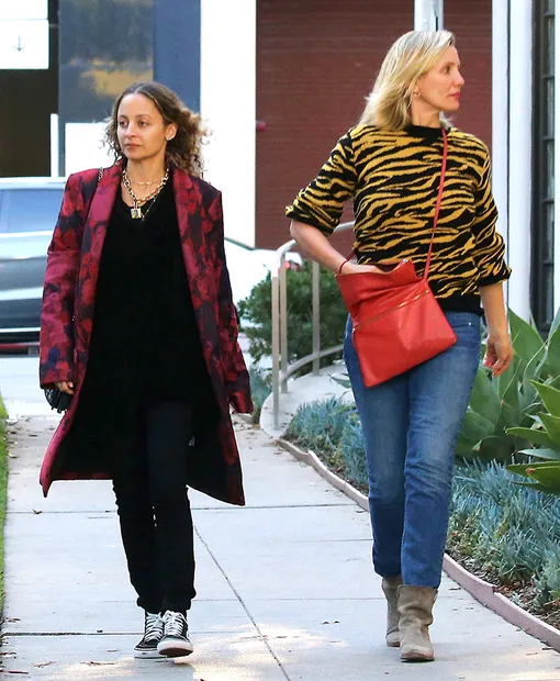 Кэмерон Диаз в джемпере с ярким анималистичным принтом гуляет в компании Николь Ричи по Беверли-Хиллз