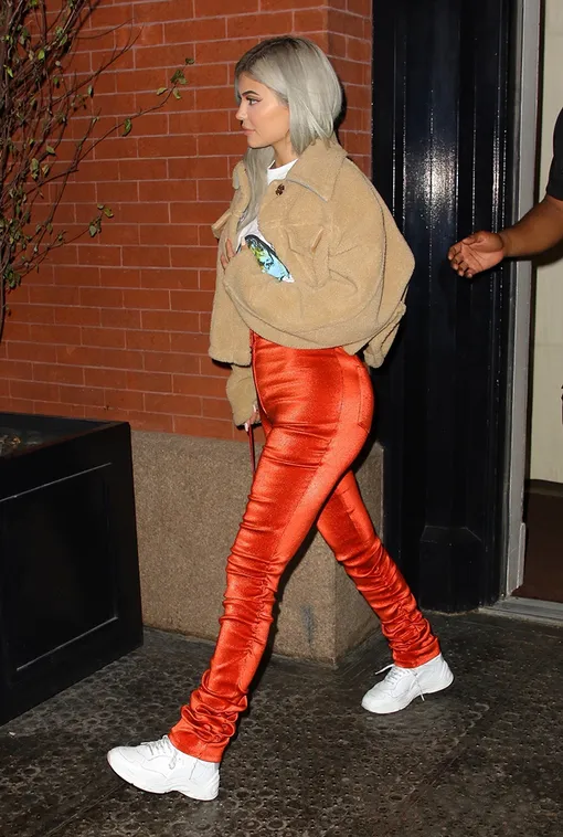 Кайли Дженнер в блестящих алых скинни и с леопардовой сумкой в Нью-Йорке