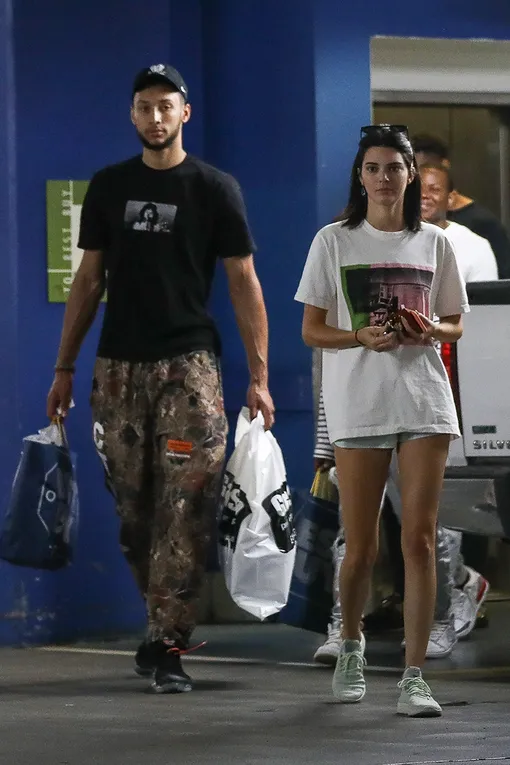 В повседневной жизни Кендалл Дженнер предпочитает комфортные образы. Под комфортом супермодель подразумевает oversize-вещи, которые преобладают в ее гардеробе. Чтобы не совсем копировать стиль своего бойфренда, баскетболиста Бена Симмонса, Кендалл надела в пару к большой футболке микрошорты, подчеркнувшие ее длинные ноги.