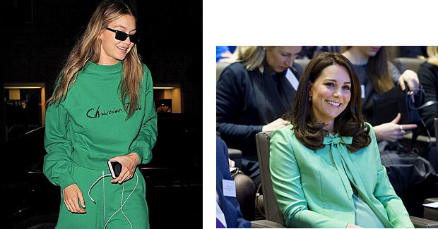 Среди звезд тоже есть немало поклонниц зеленого цвета: особенно сильно к нему неравнодушна Кейт Миддлтон, которая на днях надела сразу пальто и платье в оттенке свежей зелени. Ее поддерживают Виктория Бекхэм, которая предпочитает оттенок хаки, Малания Трамп, которая мастерски освоила всю палитру, и стритстайл-иконы Кендалл Дженнер и Джиджи Хадид, обожающие уютные трикотажные комплекты насыщенного зеленого цвета.