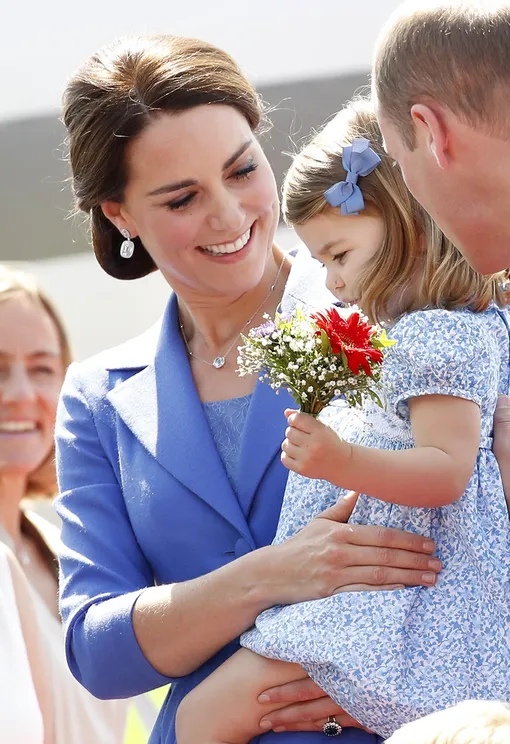 Герцог и герцогиня Кембриджские вместе с детьми продолжают европейское турне. Гости из Лондона покинули Варшаву и уже приземлились в Берлине, подарив фотографам возможность сделать безупречные кадры монаршего семейства в полном составе. Все внимание на этот раз - на парный лук Кейт Миддлтон и маленькой принцессы Шарлотты. Мама - в васильковом платье и летнем пальто от Catherine Walker, дочурка - в цветочном платьице в той же цветовой гамме. Идеальная иллюстрация на тему «дочки-матери».