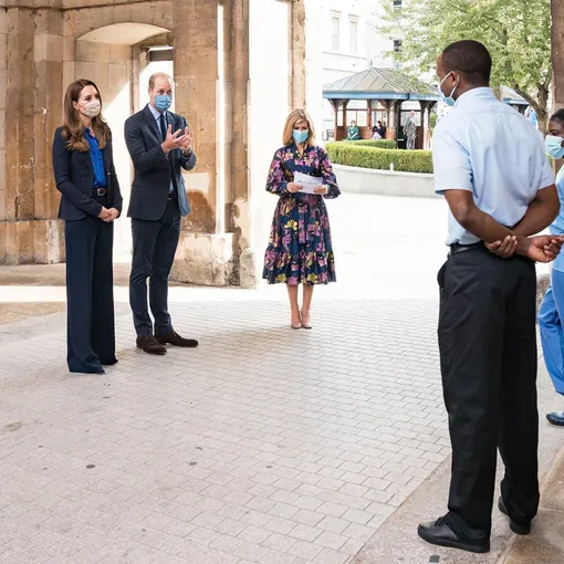 Герцогиня Кембриджская составила безупречный образ, идеально подходящий для такого случая. Кэтрин приглянулся брючный костюм насыщенного синего оттенка, который считается официальным цветом Национальной службы здравоохранения. Лаконичный приталенный пиджак в дуэте со свободными брюками подчеркнул стройную фигуру нашей героини, а кожаный ремень выделил ее тонкую талию. Завершающим штрихом ансамбля стала голубая шелковая блуза с необычной деталью в виде «радужного» принта. Во время пандемии радуга стала символом поддержки сотрудников здравоохранения, которые без устали боролись с инфекцией нового типа.