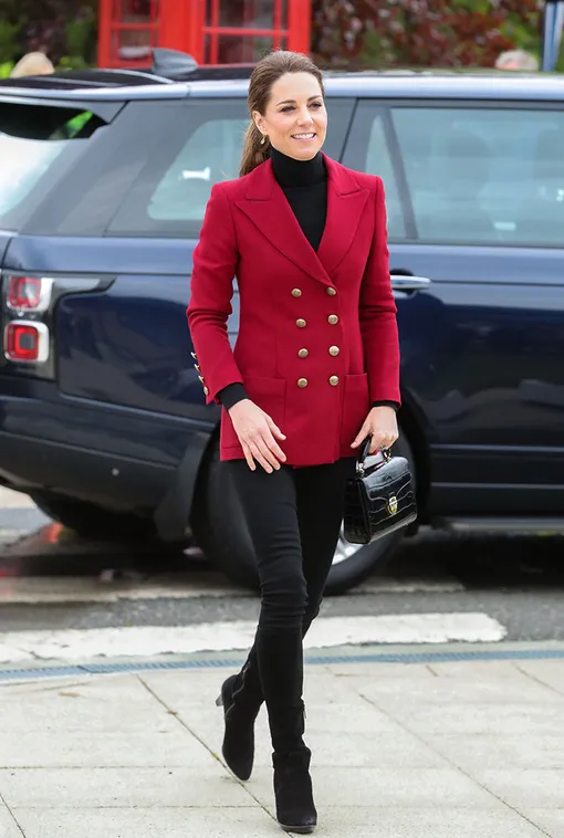 Пока Меган Маркл и принц Гарри позировали с новорожденным сыном для британских журналистов в Виндзорском замке, Кейт Миддлтон и принц Уильям в Северном Уэльсе изучали поисково-спасательную вертолетную базу береговой охраны города Карнарвон и общались с работниками воздушной скорой помощи Уэльса. Герцогиня подчеркнула подтянутую фигуру любимыми черными скинни, классической водолазкой в тон и алым удлиненным жакетом Philosophy di Lorenzo Serafini. Замшевые ботильоны на среднем каблуке завершили образ и не дали многодетной маме замерзнуть в дождливый прохладный день.