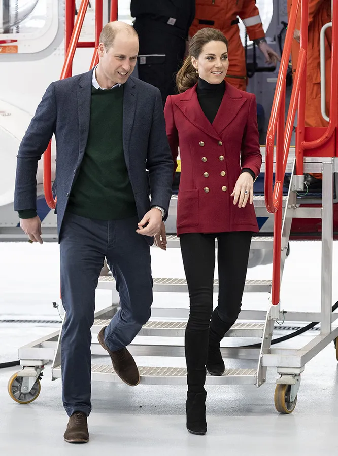 Пока Меган Маркл и принц Гарри позировали с новорожденным сыном для британских журналистов в Виндзорском замке, Кейт Миддлтон и принц Уильям в Северном Уэльсе изучали поисково-спасательную вертолетную базу береговой охраны города Карнарвон и общались с работниками воздушной скорой помощи Уэльса. Герцогиня подчеркнула подтянутую фигуру любимыми черными скинни, классической водолазкой в тон и алым удлиненным жакетом Philosophy di Lorenzo Serafini. Замшевые ботильоны на среднем каблуке завершили образ и не дали многодетной маме замерзнуть в дождливый прохладный день.