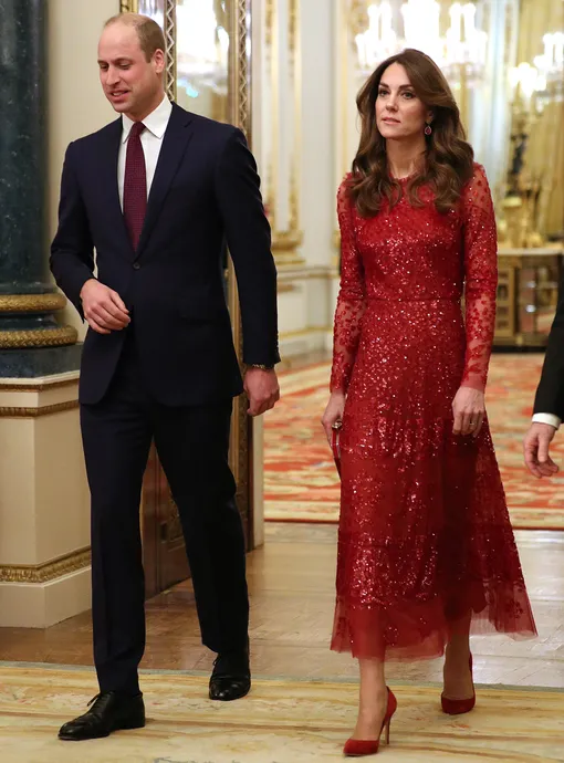 Кейт Миддлтон в алом платье и замшевых лодочках принимает гостей в Букингемском дворце