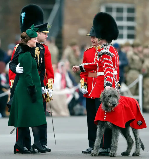 Следуя обычаю, который берет свое начало в 1901 году, герцогиня вручила гвардейцам веточки трилистника, символизирующие праздник. Вниманием не был обделен и главный участник парада — талисман батальона, ирландский волкодав по кличке Доннелл.