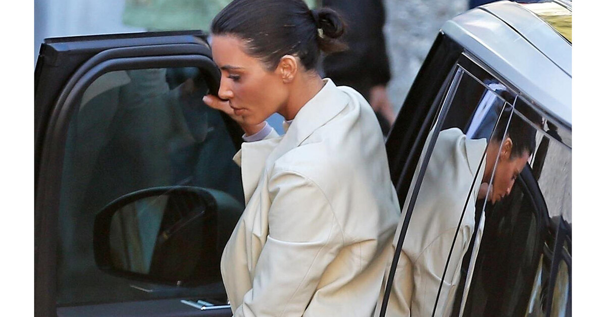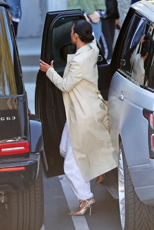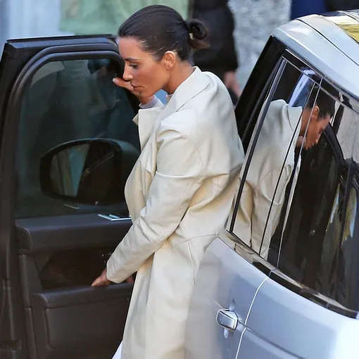 Пока большинство звезд в Милане порхают с одного показа на другой, Ким Кардашьян мирно проводит будние дни в Калабасасе, где у ее супруга Канье Уэста расположена студия. Накануне днем папарацци застали реалити-диву во время визита к мужу: она вышла из автомобиля в бежевом кожаном тренче, белоснежных шароварах с резинками на щиколотках и прозрачных туфлях Yeezy авторства опять же своего благоверного.